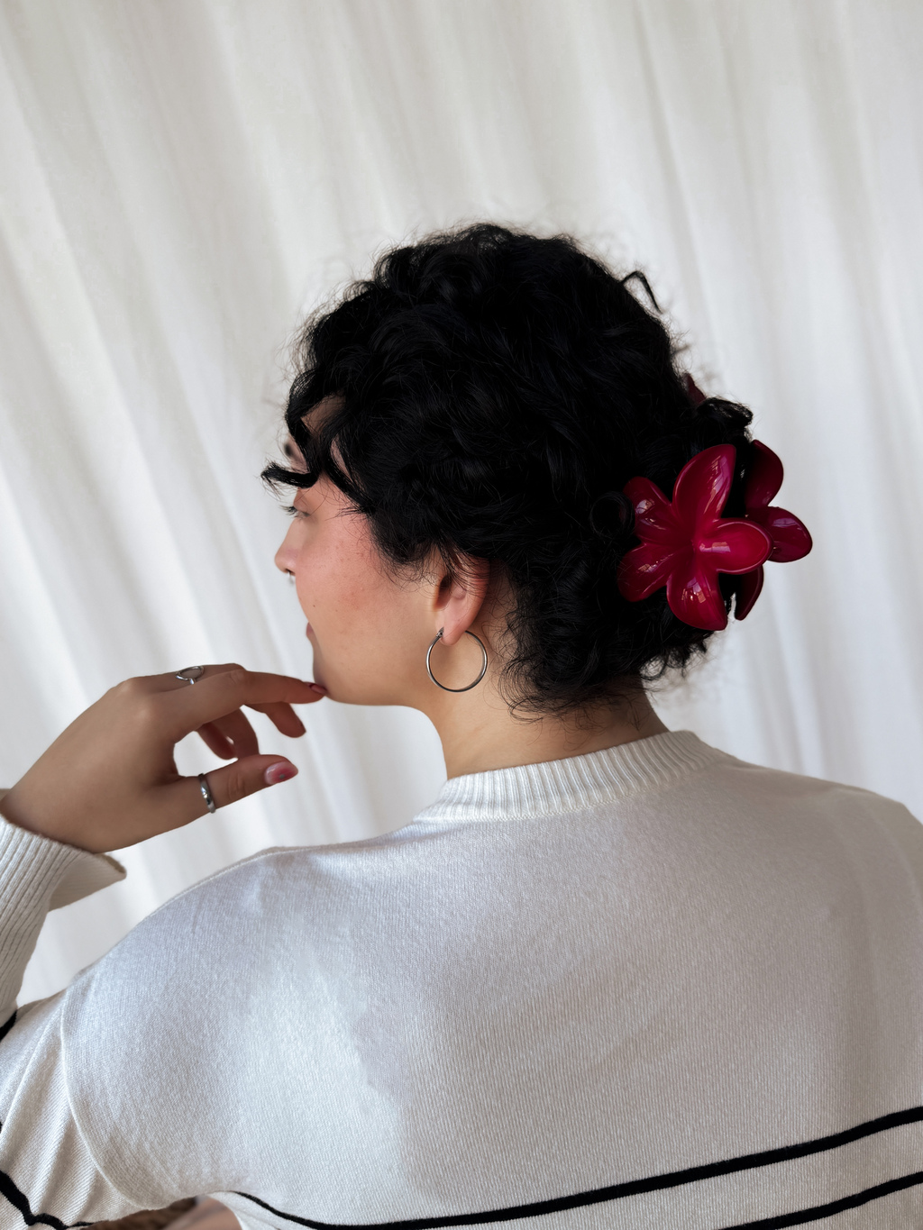 Es un broche XL con forma de flor, hecho de plástico de alta calidad, resistente y liviano. Ideal para sostener hasta el cabello más abundante con estilo y sin tirones. Un toque femenino, moderno y práctico que vas a querer usar todos los días